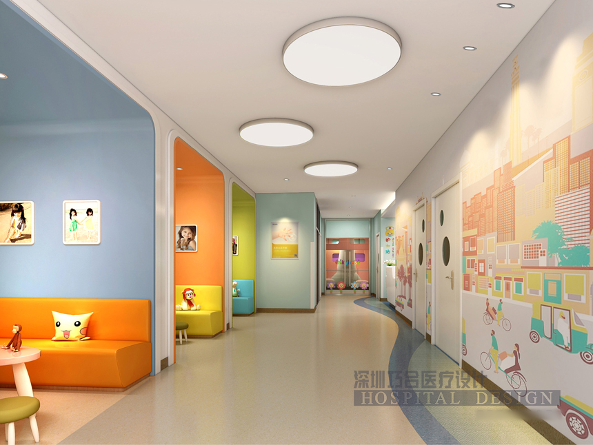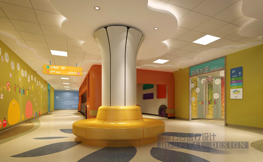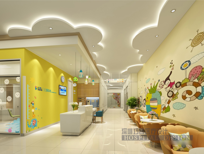 兒科區(qū)的設(shè)計(jì)以“金色童年”為主題,借助豐富的環(huán)境圖形、燈光設(shè)計(jì)及軟裝搭配,構(gòu)筑一個(gè)充滿歡樂的童夢(mèng)園。主題墻貼成本較低,且便于后期管理。