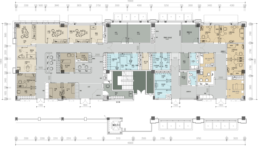 具體包括:護(hù)士站設(shè)置在大廳中軸,可以兼顧兩側(cè)門診的照護(hù)需求。而口腔治療室則依外墻而設(shè),借用室外街景和光照調(diào)劑身心壓力。