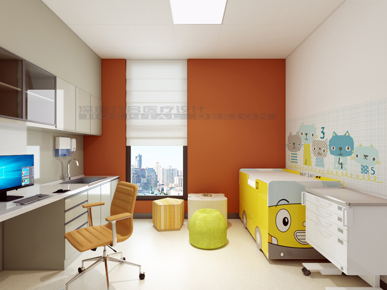 比如,兒科門診單元就有一些童趣和感性的設(shè)計(jì)表現(xiàn)。等候區(qū)墻壁上有繪畫,診室內(nèi)部就用墻貼圖形來(lái)呼應(yīng),還包括設(shè)計(jì)成卡通火車形象的診床。這些設(shè)計(jì)元素對(duì)孩子們來(lái)說(shuō),無(wú)論色彩還是圖形都很容易理解,并且能獲得他們的情感互動(dòng)。因此,這里對(duì)他們來(lái)說(shuō)也變得親切起來(lái)。