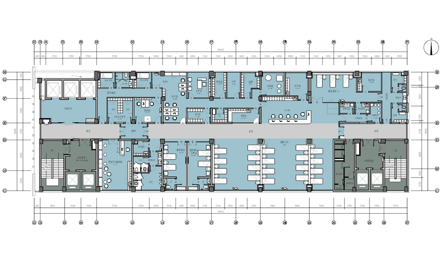 建筑面積1100平米,平面布局主要包括透析間、搶救室及輔助用房。在平面設(shè)計(jì)過(guò)程中,我們參照整個(gè)醫(yī)療流程和人、物流動(dòng)線,將透析大廳的護(hù)士站設(shè)置在中軸位置,以便全面監(jiān)測(cè)大廳情況,及時(shí)響應(yīng)患者和家屬的需求。
