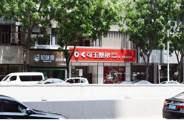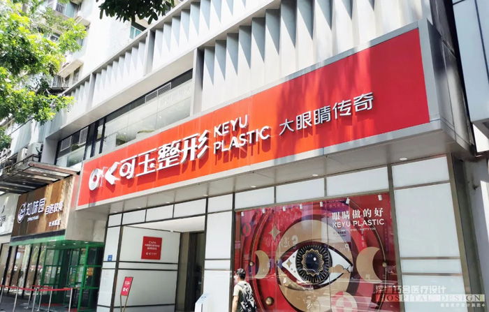 先看門頭。強(qiáng)烈的色彩放大了店招的視覺刺激,櫥窗廣告設(shè)計(jì)也非常出彩,“可玉整形=大眼睛傳奇”的信號瞬間激活。