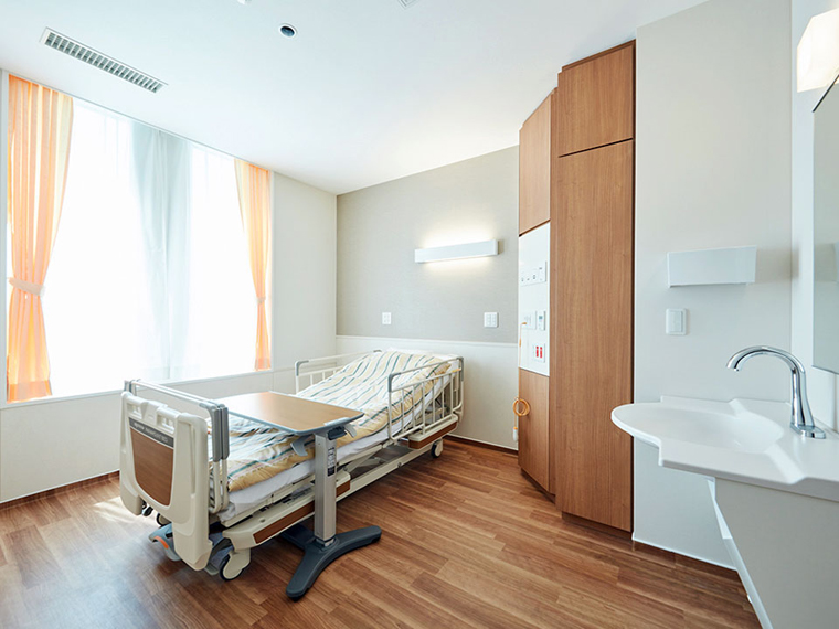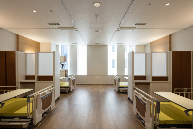 雖然堅持極簡設(shè)計,但在便捷度和舒適性方面,虎之門病院的表現(xiàn),只能說相當(dāng)精彩。重點介紹下病房區(qū)域。只保留必需的設(shè)備和家具,同時在細(xì)節(jié)上考慮到安全、隱私和舒適。像4人間病房這里,相鄰病床利用邊柜作為隔斷,創(chuàng)造了隱私空間。如果對個人隱私及住院環(huán)境有更高要求,可以選擇單間病房。