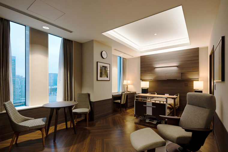 醫(yī)院提供3種規(guī)格的單間病房選擇。這是43平米的單間,提供Wi-Fi、電視及配套設(shè)施,如洗手盆、衛(wèi)生間、浴缸。除了面積增加到57平米,配套設(shè)施也升級了,包括50英寸電視、辦公桌椅、沙發(fā)和餐具,微波爐、冰箱、電熱水壺、吹風(fēng)機等家用電器也很齊全,甚至還有保險箱服務(wù)和專門的禮賓服務(wù)。這種規(guī)格的病房環(huán)境,除了享受,我想不出別的形容詞了。虎之門病院的極簡設(shè)計,是基于國際化城市背景,對現(xiàn)代和傳統(tǒng)、國際與本土對立的協(xié)調(diào)。探究其背后的意義,是擯棄多余裝飾,一切圍繞用戶體驗。這是傳承,也是創(chuàng)新,更是對回歸醫(yī)療本質(zhì)的注解。