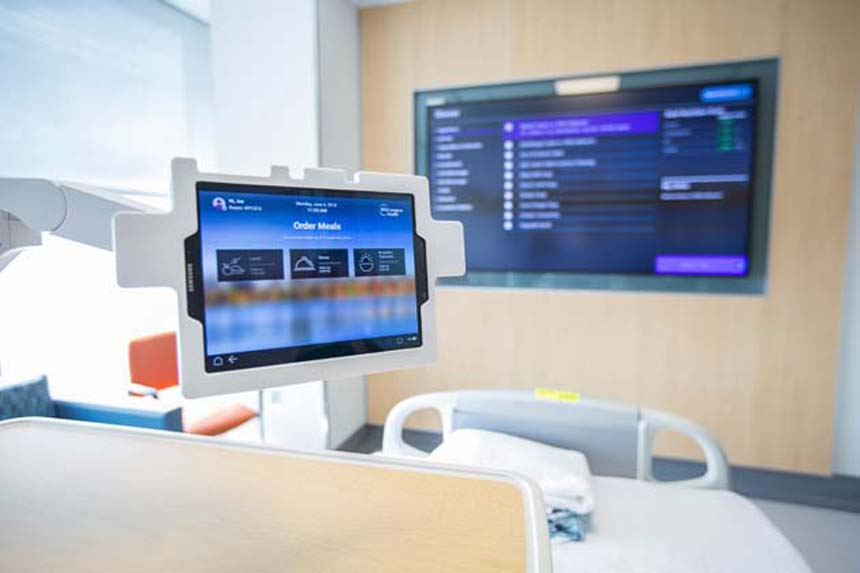 其中重點(diǎn)是名為“ My Wall”的設(shè)備,由墻上LEED屏和床頭觸摸屏平板電腦組成,患者可以訪問(wèn)教育資料、觀看電視電影或訂餐,以及與家屬交流,還能調(diào)控室溫和照明。