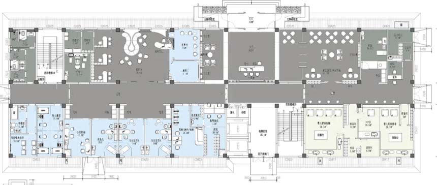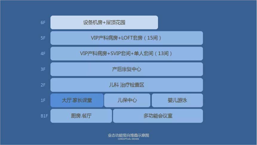 要解決的第一個問題是平面規(guī)劃。這是一個7層單體大樓,地面建筑面積6890平米。平面方案實行功能分區(qū),后勤、醫(yī)療、休閑各單元互不干擾:B1層設餐廳和行政會議室,頂樓布局設備機房和屋頂花園,1-5樓則集中規(guī)劃了醫(yī)療單元。
