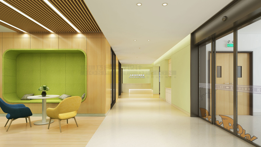 一樓大廳接待臺以石材和木飾面表現(xiàn)空間的平穩(wěn)中正。兒童成長中心除了借助墻貼、玻璃門貼畫,以及柔和的照明來塑造環(huán)境氛圍。