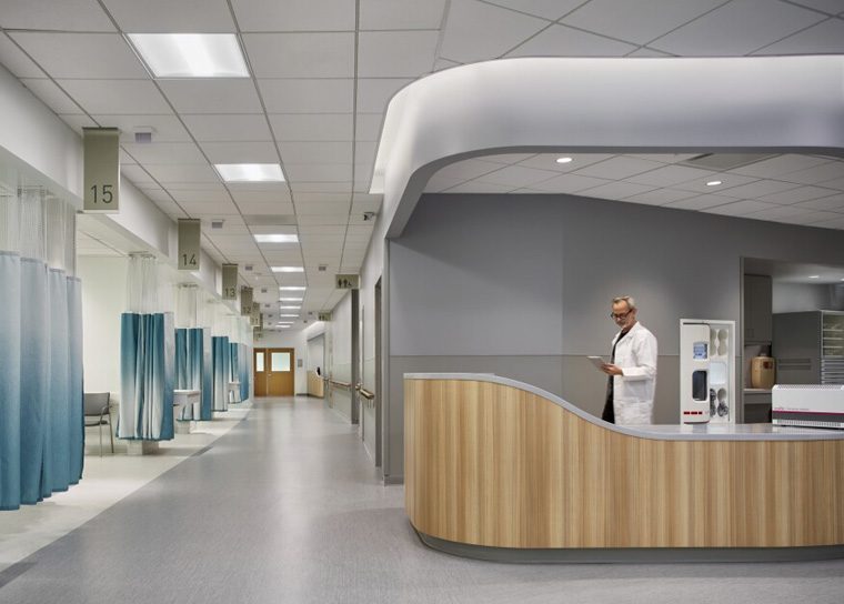 在治療室、重癥監(jiān)護(hù)病房等關(guān)鍵區(qū)域,數(shù)字編碼導(dǎo)視牌塑造效率,藍(lán)綠色圍簾和藍(lán)色墻板體現(xiàn)了醫(yī)療場(chǎng)所的平靜與專(zhuān)注,并借助木飾面來(lái)增加溫暖感。