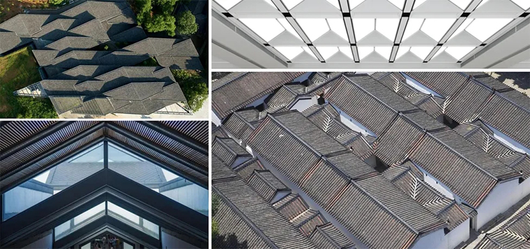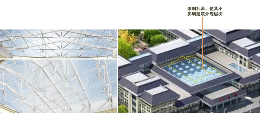 中庭的采光頂借鑒了傳統(tǒng)建筑式樣,但功能考量著眼于當(dāng)下及可持續(xù):限制標(biāo)高以不影響建筑層次電動(dòng)天幕遮陽簾智能控溫且節(jié)能環(huán)保。