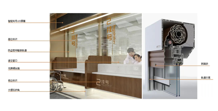 細(xì)節(jié)處的功能設(shè)計(jì)還體現(xiàn)在收費(fèi)掛號(hào)窗口這里??紤]到醫(yī)院作為縣域殘障人士康復(fù)中心的服務(wù)功能,設(shè)置高、低位標(biāo)識(shí),使用無障礙臺(tái)面。