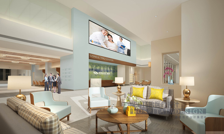 醫(yī)院復雜的平面功能形態(tài),常常導致采光空間零散的問題。所以,本案中的醫(yī)院門診空間設(shè)計,采用了柔和的空間色調(diào),來提高空間明度及強調(diào)溫馨感。