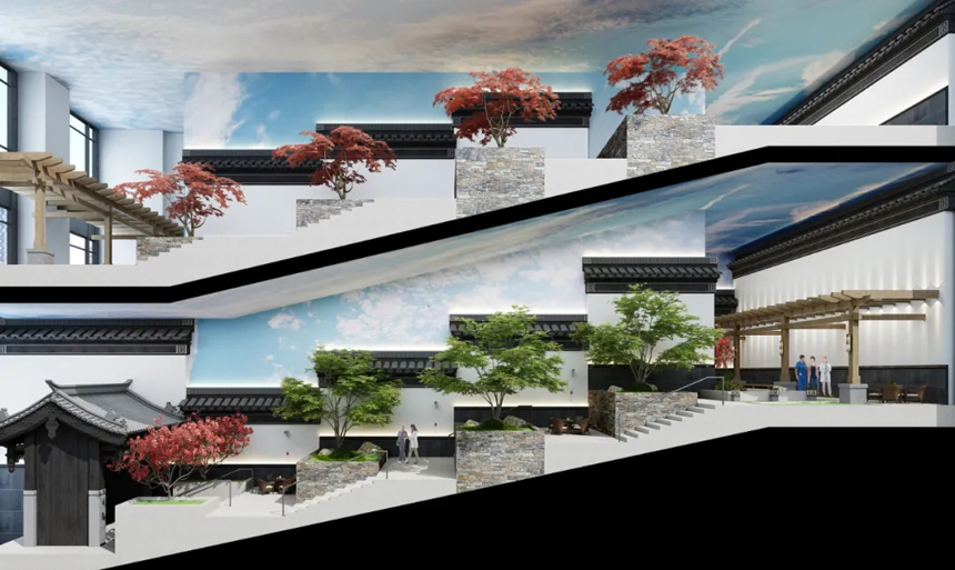 將原建筑的車道改造為生態(tài)步道,引入涼亭、綠植、水景等自然環(huán)境元素,擬態(tài)了中國傳統(tǒng)審美的意境,同時符合自然環(huán)境促進(jìn)身心健康的現(xiàn)代科學(xué)理論。