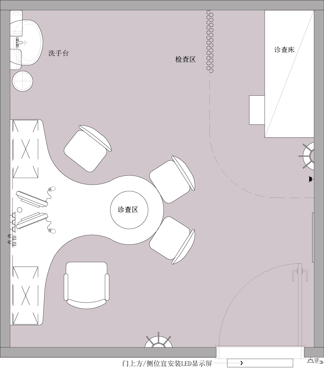 3、帶檢查床的診室,檢查床建議靠墻,醫(yī)生在一邊檢查時(shí)防止病人從另外一邊滑落,且醫(yī)生位置在患者右邊,遵循醫(yī)生右手操作原則。