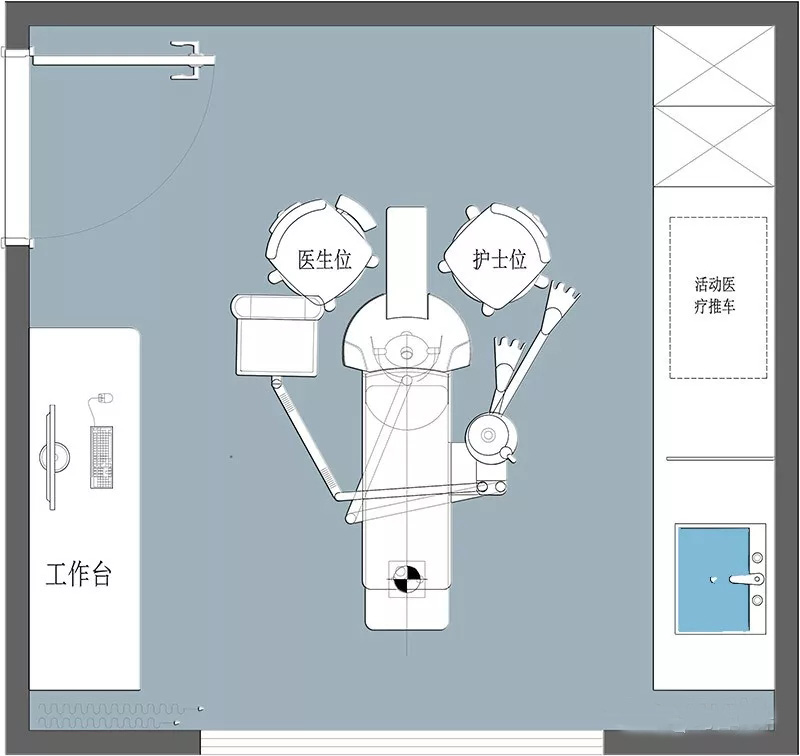 不同科室的診室,平面布局有所不同。比如婦科診室檢查項(xiàng)目較多,面積設(shè)置應(yīng)不小于15還要做好潔污分區(qū)。而口腔診室的平面布局,要注意滿足這一空間感染控制的需求。每椅中距應(yīng)不小于1.8米,椅中心距墻應(yīng)不小于1.2米。對(duì)于隔斷診間,注意每個(gè)隔斷區(qū)均應(yīng)配備水池。