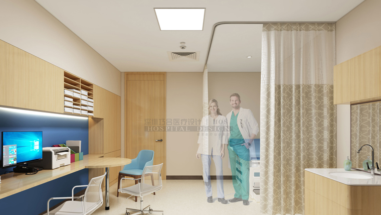 診室內(nèi)部注意保護(hù)患者隱私,使用了圍簾。也考慮到了醫(yī)護(hù)人員的需求,使用集成式家具,便于空間收納和管理。
