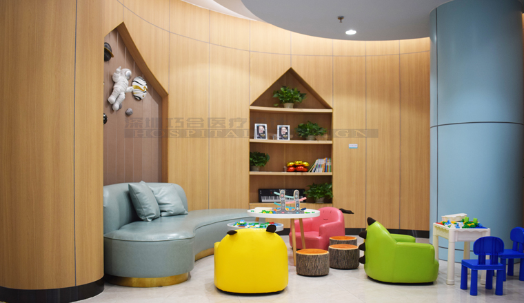 木飾面上墻是這個口腔門診中最常見的裝飾方法,在視覺上具有使人放松的天然優(yōu)勢。并且,木飾面還可以做造型變化,比如兒童活動區(qū)的木屋造型,物品寄存柜離地,在嵌入式燈條的映照下表現(xiàn)出奇妙的懸浮效果,而且能從視覺效果上減輕柜體體量感。