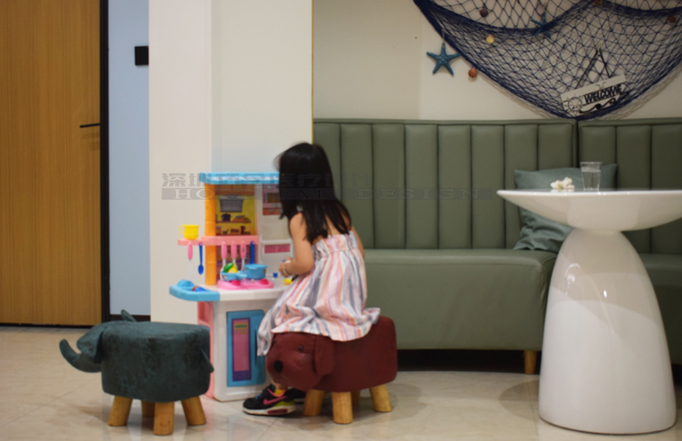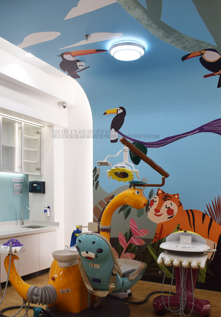 兒童齒科護(hù)理的一側(cè)雖然沒有戶外采光,但為孩子們設(shè)計了一個活動區(qū),口腔治療室內(nèi)則借助大幅動物圖形墻貼制造歡樂氛圍。
