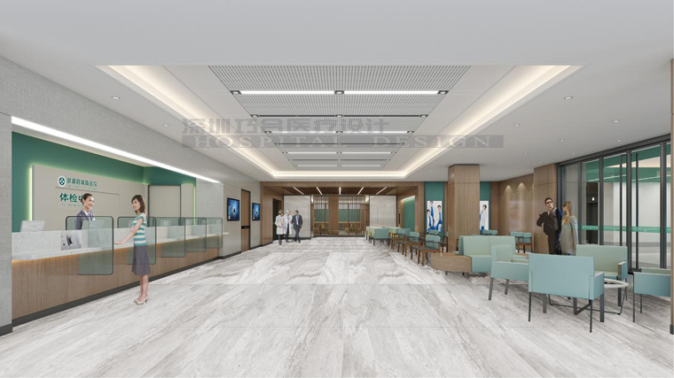 當(dāng)視角轉(zhuǎn)換到體檢中心,是大方開朗的空間格局。玻璃、仿石材、木飾面、皮質(zhì)軟包等現(xiàn)代材料的應(yīng)用,凸顯了現(xiàn)代科技感。而空間的色彩搭配也較為沉穩(wěn),強(qiáng)調(diào)空間質(zhì)感。
