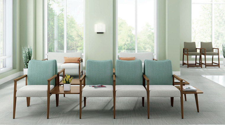 醫(yī)療家具的尺度,除了要根據(jù)空間大小和使用需求,確定家具尺寸,還要考慮到不同人群的活動空間,將家具的尺度調(diào)整恰當,包括座椅的深度及扶手的高度,還有坐凳的高度,確保使用方便、舒適。比如考慮到肥胖患者的體型特點,等候區(qū)可以配置幾把加寬椅。這種通用設計也是無障礙設計理念的體現(xiàn)。