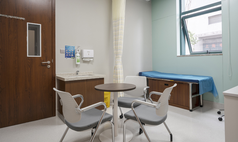 以診室為例,上海冬雷腦科醫(yī)院的診室,創(chuàng)新地應用了診桌+沙發(fā)椅+診床圓幾+診床的家具組合,在靈活利用空間的基礎上,還增加了放松感。沙發(fā)椅以高密度高回彈海綿填充,透氣且不易變形,坐感會更舒適。而檢查床靠墻的布置,符合醫(yī)生右手操作原則,有利于提高醫(yī)療效率和安全。