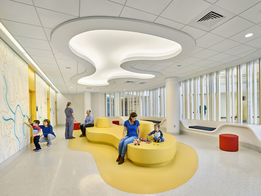 兒科中心也在一樓。明黃色沙發(fā)是空間的視覺焦點,和造型俏皮的天花照明相呼應(yīng)?;訅t描繪了弗吉尼亞州的雪蘭多山谷地形,孩子們通過內(nèi)置軌道和動物模型,與醫(yī)院空間乃至當(dāng)?shù)丨h(huán)境進行互動。