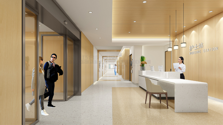 在平面功能之外,環(huán)境也是影響醫(yī)療服務體驗的重要因素。項目采用現(xiàn)代簡約設計風格,其中最常見的表現(xiàn)手法包括采光、淺色木飾面和木框架皮質沙發(fā)椅。這種固定搭配構成了整個大樓的氛圍基調——放松,舒適,自然。