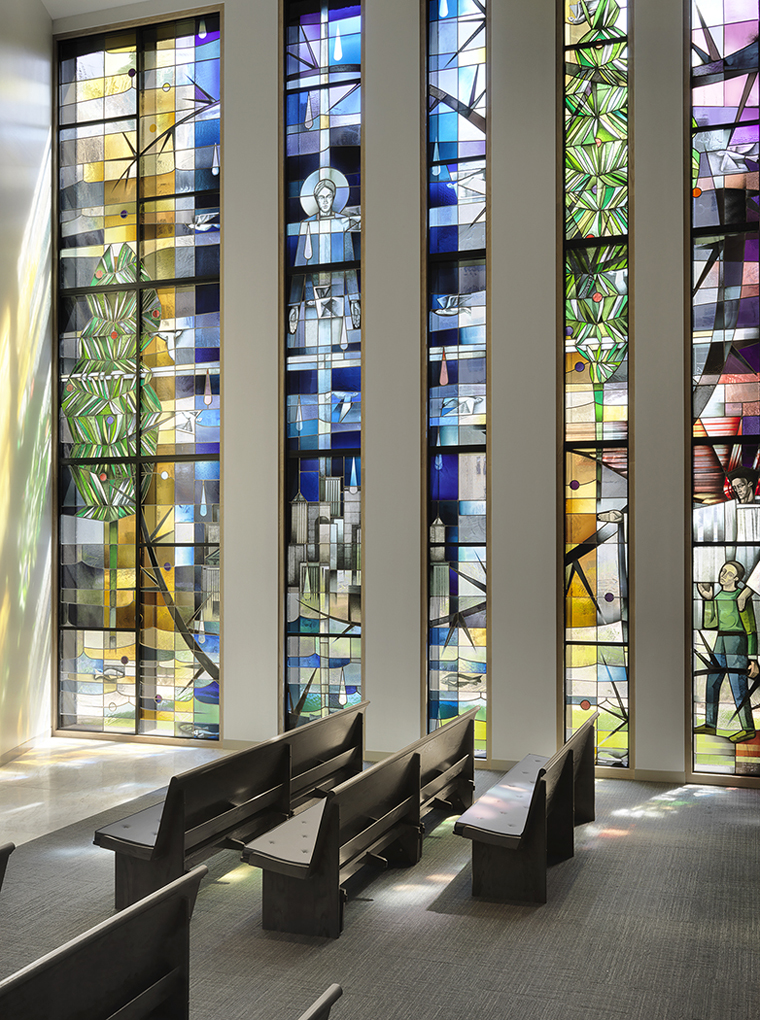 但在祈禱室親見彩繪玻璃以及日光穿透玻璃投下的光影,這幅糅合了藝術(shù)、宗教和科學(xué)的景象,又是另一種動人及治愈。