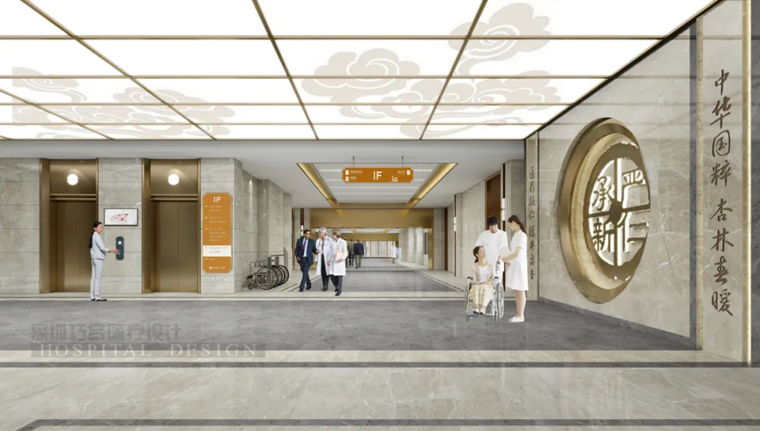 同時(shí),將中國傳統(tǒng)建筑形式和裝飾紋樣應(yīng)用于門診大廳,既取其“庇護(hù)傳承”之意,又通過形式演變滿足現(xiàn)代醫(yī)學(xué)空間的功能需求及環(huán)境審美。