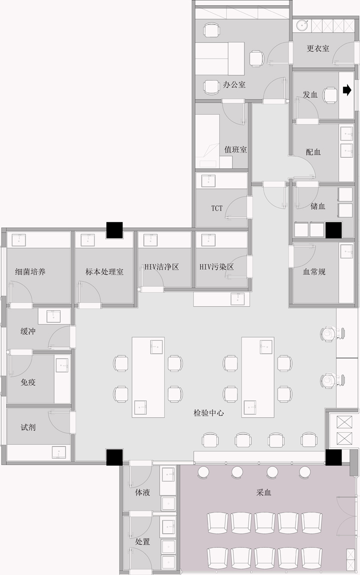 生活區(qū):辦公室、會(huì)議室、更衣室、值班室、休息室、儲(chǔ)藏室、培養(yǎng)室、試劑室。