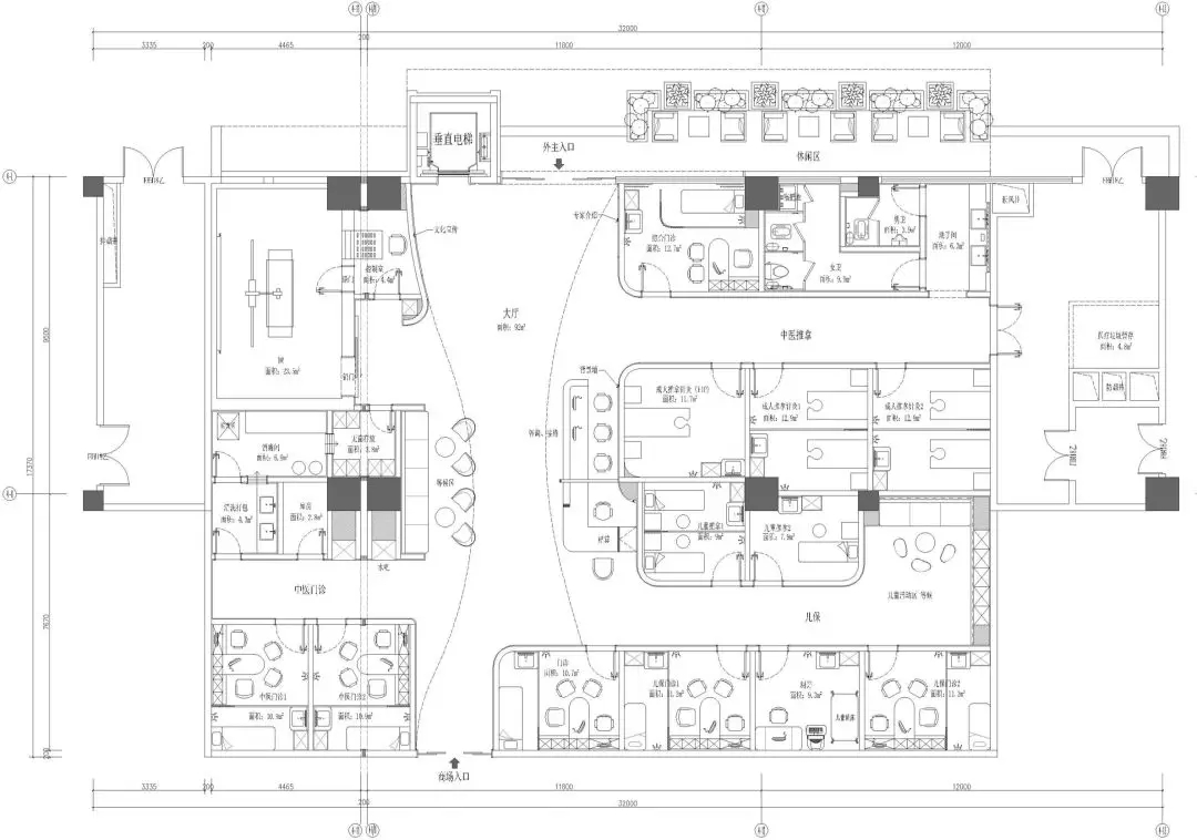 比如,二層大廳以接待臺為中軸,兩側(cè)分設(shè)收費(fèi)、取藥窗口,并設(shè)計(jì)了A、B兩個通道,促進(jìn)效率和安全。